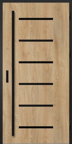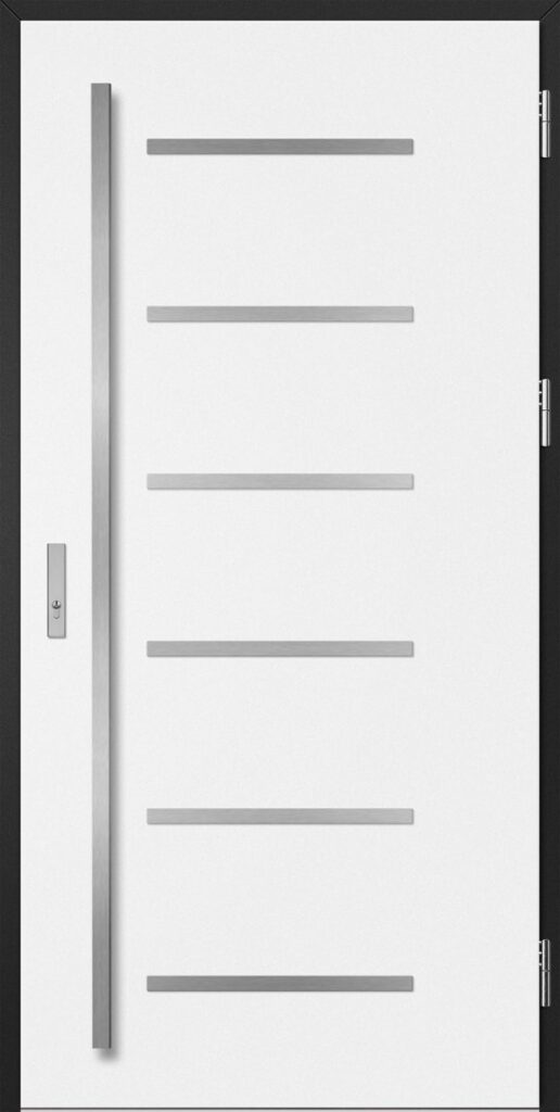 Türen aus Stahlblech, geschützt mit PVC-Furnier, das sich durch eine hohe Widerstandsfähigkeit gegen wechselnde Witterungsbedingungen und UV-Strahlung auszeichnet. Die Verwendung von hochwertigen Materialien garantiert nicht nur Ästhetik, sondern auch Langlebigkeit und Sicherheit für viele Jahre.