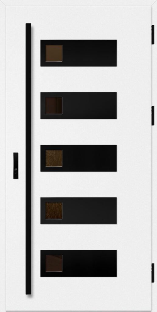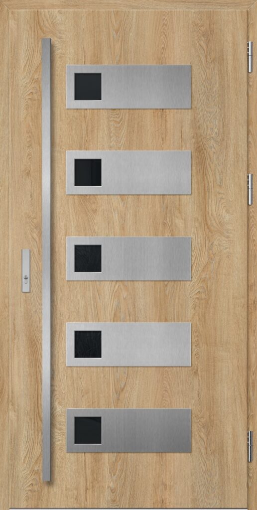Türen aus Stahlblech, geschützt mit PVC-Furnier, das sich durch eine hohe Widerstandsfähigkeit gegen wechselnde Witterungsbedingungen und UV-Strahlung auszeichnet. Die Verwendung von hochwertigen Materialien garantiert nicht nur Ästhetik, sondern auch Langlebigkeit und Sicherheit für viele Jahre.