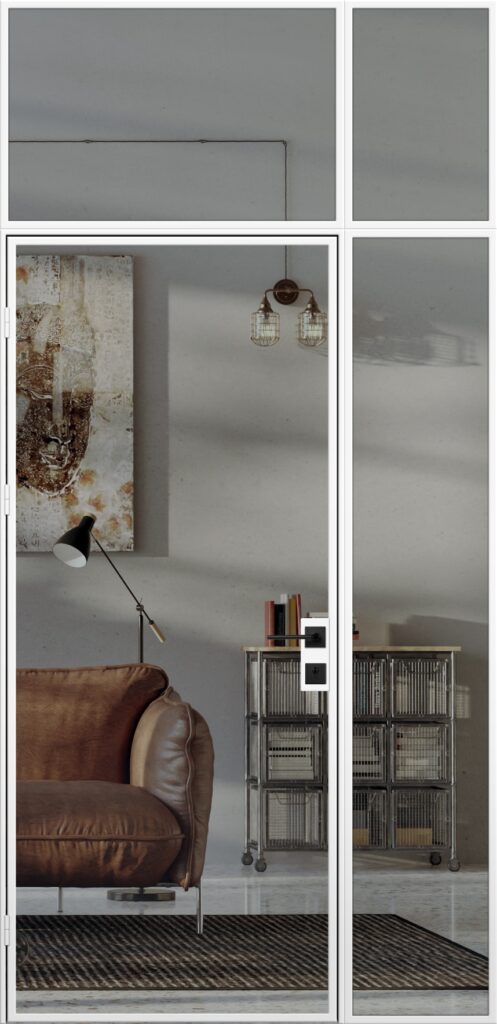 “LOFT BASIC 1” is a door that is a combination of functionality and modern design. Made of high-quality steel profiles, these doors are glazed, and steel muntins 20 mm wide and 2 mm thick have been glued to the glass sheet, creating a striking industrial look. The frame of the leaf and fanlight is powder-coated in black or STR white, and finishing in RAL colors is possible at an extra charge. The use of tempered clear glass ensures maximum light transmission, while maintaining full functionality. In addition, the door is equipped with steel hinges and a magnetic lock, which ensures the comfort of use. This model is characterized by simple, elegant aesthetics, perfectly fitting in modern interiors with an industrial character. Thanks to a wide range of dimensional options and personalization possibilities (including different fanlight variants), “LOFT BASIC 1” is a door ideal for any interior, where both design and functionality matter.
