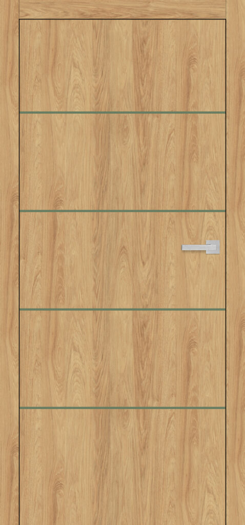 Intarsje to dekoracyjne wstawki idealnie zlicowane z powierzchnią okleiny, występują po obu stronach drzwi w kolorze oliwkowym
