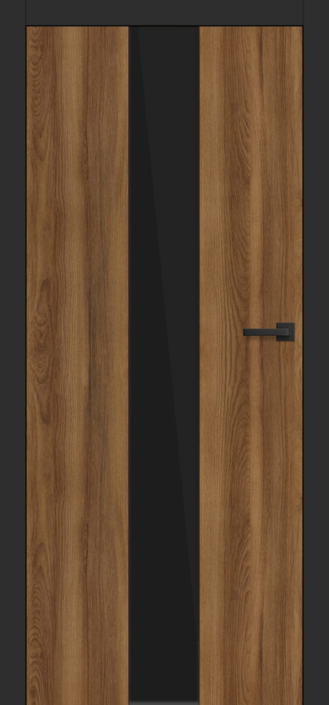 - bord du vantail recouvert de chant de la couleur de la surface ou, en option, en noir uni (dans le décor DAB NATUR POPRZECZNY PREMIUM, chant noir avec structure transversale) ; pour les couleurs noires, le bord est recouvert partiellement (deux côtés verticaux et le haut) ainsi qu’au niveau du vitrage