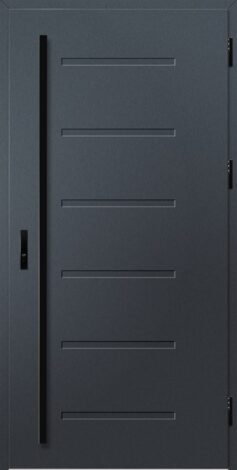 • Chambranle en aluminium, peint en noir et recouvert d'un film de la couleur du vantail de porte, équipé d'un seuil en aluminium chaud et d'une plinthe complète avec réglage de la pression pour les portes fabriquées selon la technologie THERMO HOT.