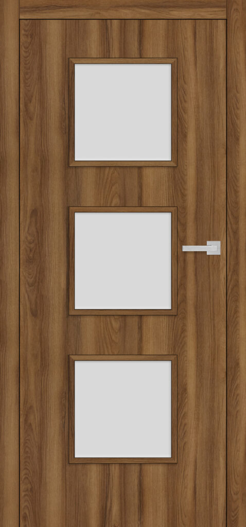 Gładkie skrzydło zdobi pionowa kolumna kwadratowych ramek – pełnych lub przeszklonych. Dostępne są różne warianty ułożenia i trzy wielkości płycin, co ułatwia dopasowanie modelu do wnętrza i indywidualnego stylu.