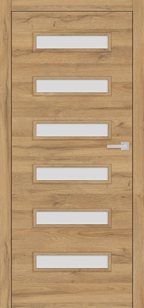 Drzwi Sorano to ukłon w stronę geometrycznego minimalizmu w jego najbardziej wyważonej, poziomej odsłonie. Gładkie skrzydło wzbogaciliśmy o rytmiczny układ prostokątnych ramek – pełnych lub przeszklonych – dostępnych w trzech rozmiarach. Dzięki temu każdy model łatwo dopasujesz do charakteru wnętrza i własnego poczucia proporcji.