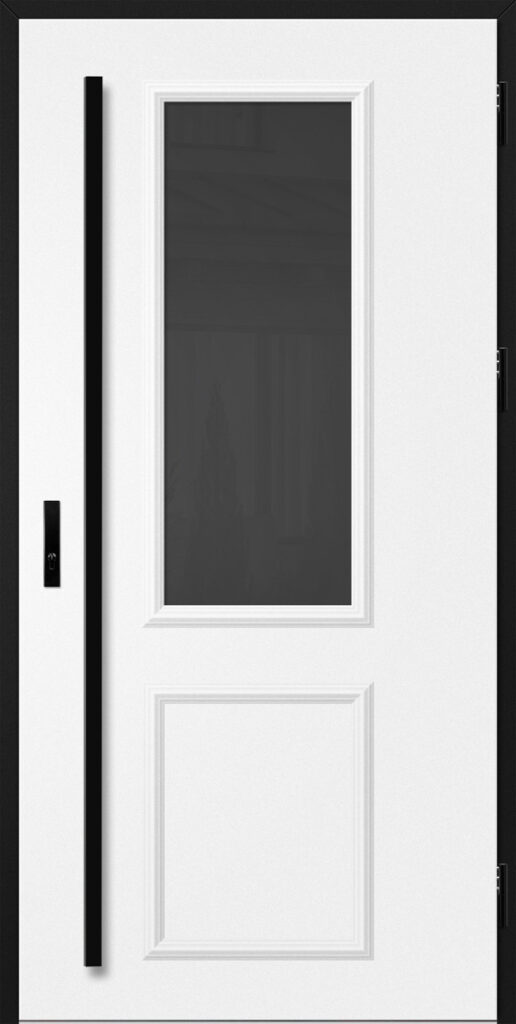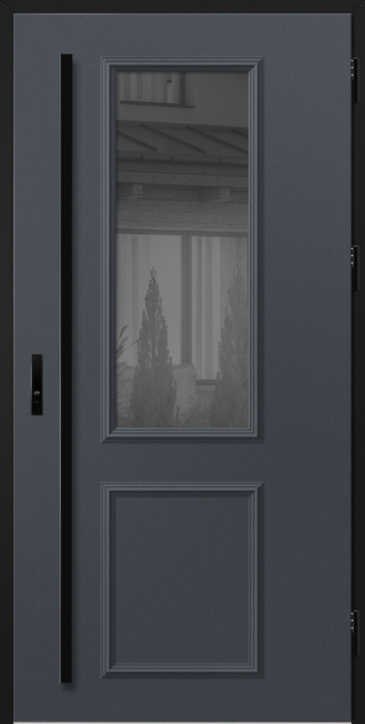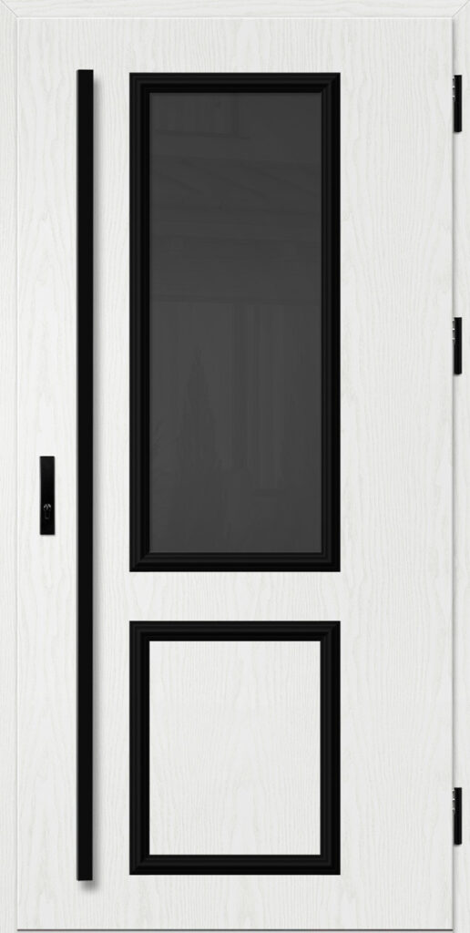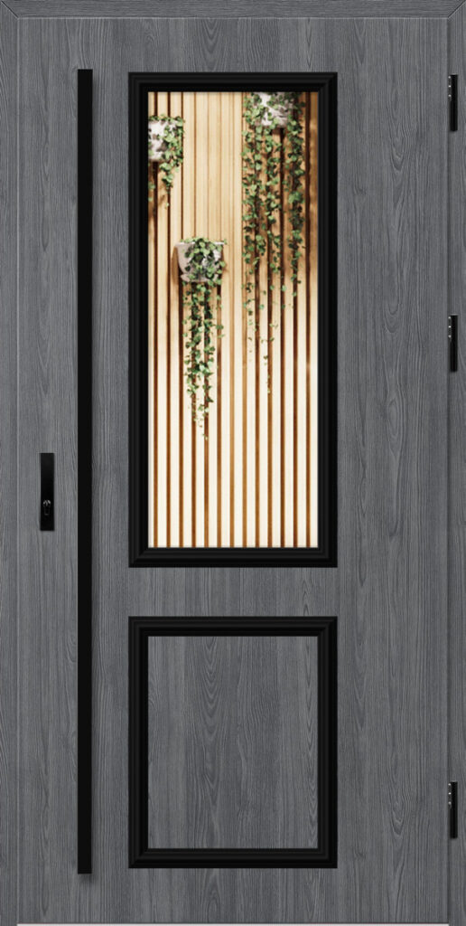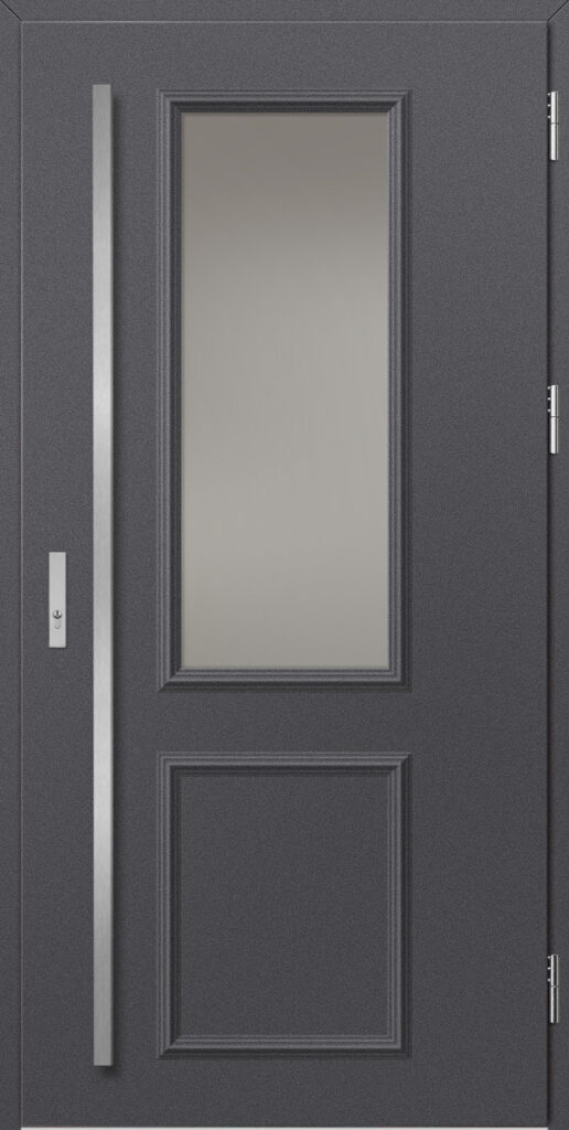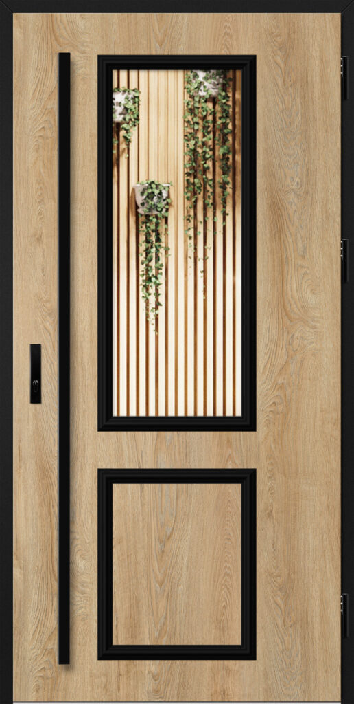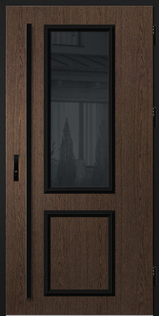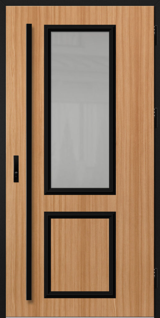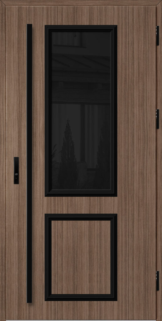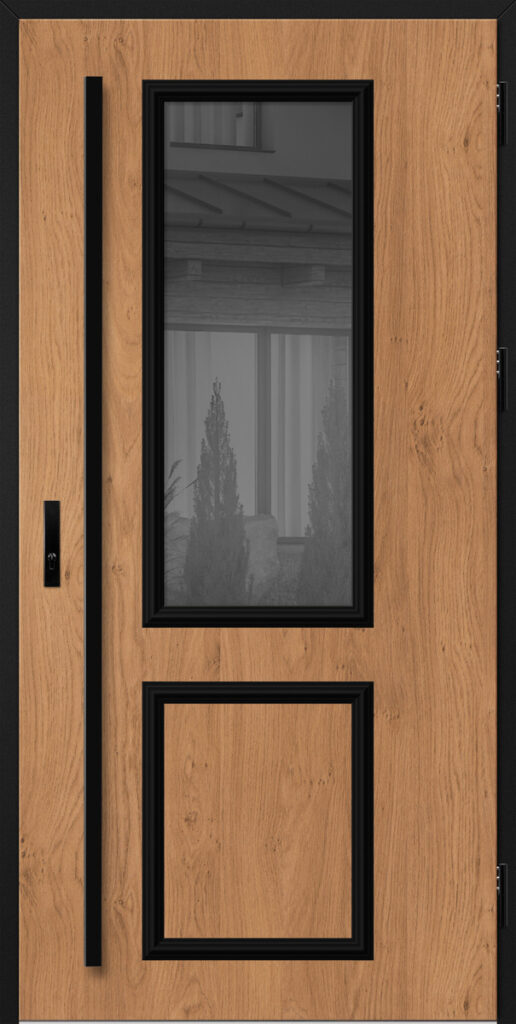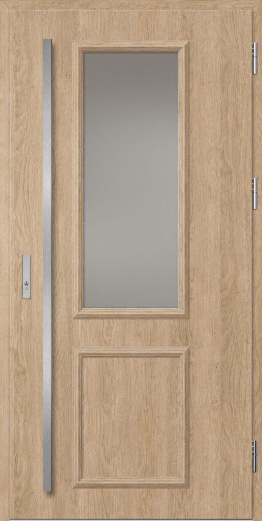 Drzwi wykonane z blachy stalowej, zabezpieczone okleiną PCV, która odznacza się wysoką odpornością na zmienne warunki atmosferyczne, promieniowanie UV. Zastosowanie wysokiej jakości materiałów, gwarantuje nie tylko estetykę, ale również trwałość i bezpieczeństwo na lata.