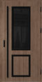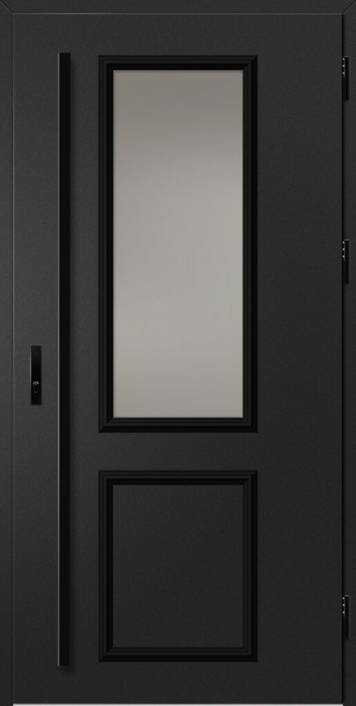 Ościeżnica aluminiowa, malowana na czarno i oklejona w kolorze skrzydła drzwiowego wyposażona w ciepły próg aluminiowy i pełną listwę zaczepową z regulacją docisku dla drzwi wykonanych w technologii THERMO HOT.