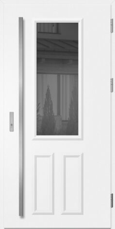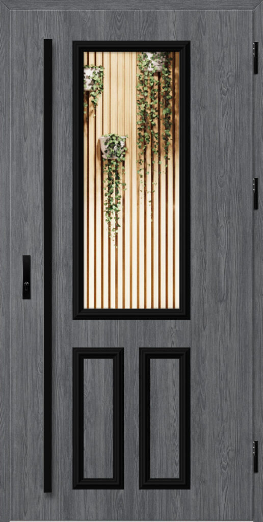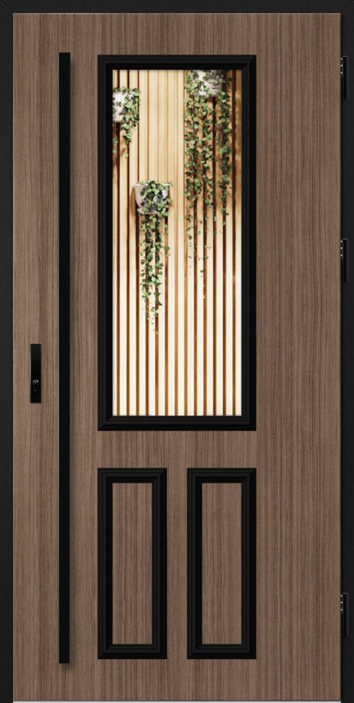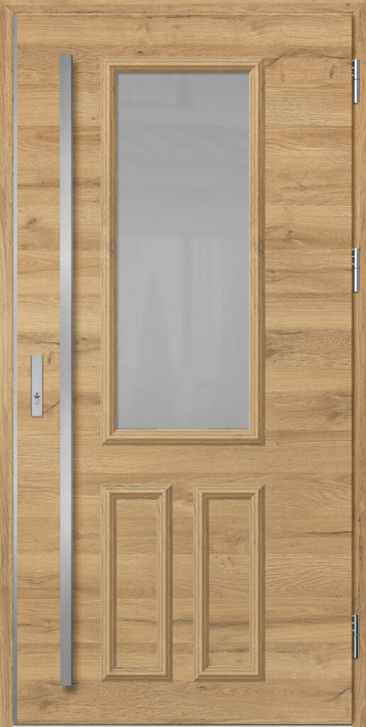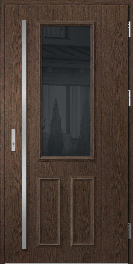 Drzwi wykonane z blachy stalowej, zabezpieczone okleiną PCV, która odznacza się wysoką odpornością na zmienne warunki atmosferyczne, promieniowanie UV. Zastosowanie wysokiej jakości materiałów, gwarantuje nie tylko estetykę, ale również trwałość i bezpieczeństwo na lata.