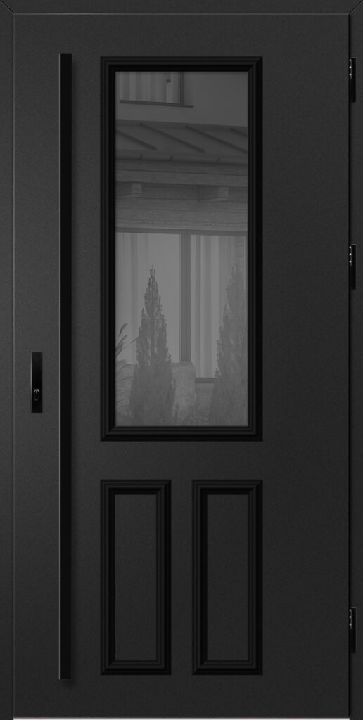 Ościeżnica aluminiowa, malowana na czarno i oklejona w kolorze skrzydła drzwiowego wyposażona w ciepły próg aluminiowy i pełną listwę zaczepową z regulacją docisku dla drzwi wykonanych w technologii THERMO HOT.