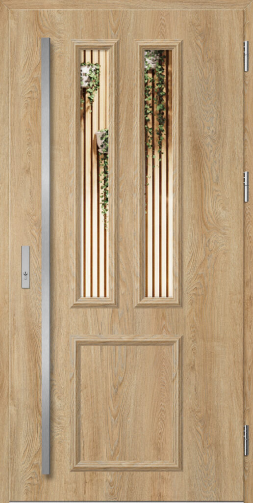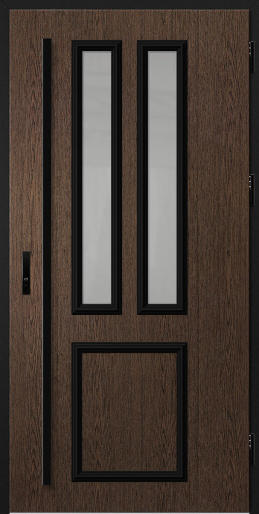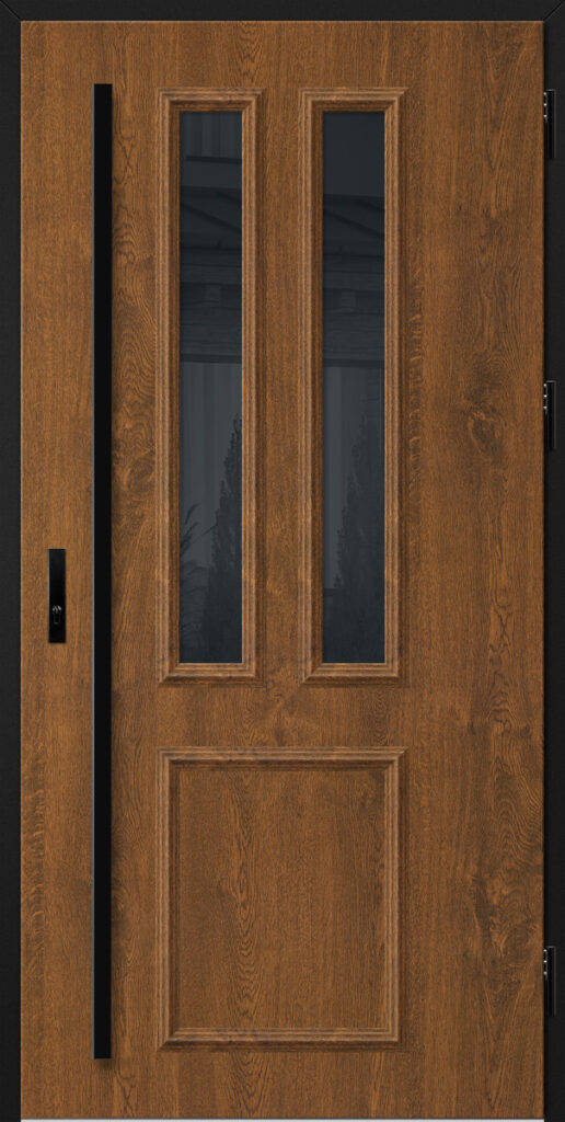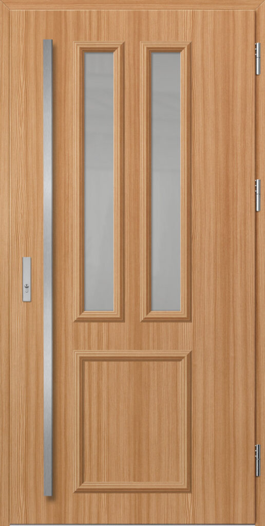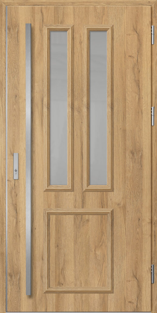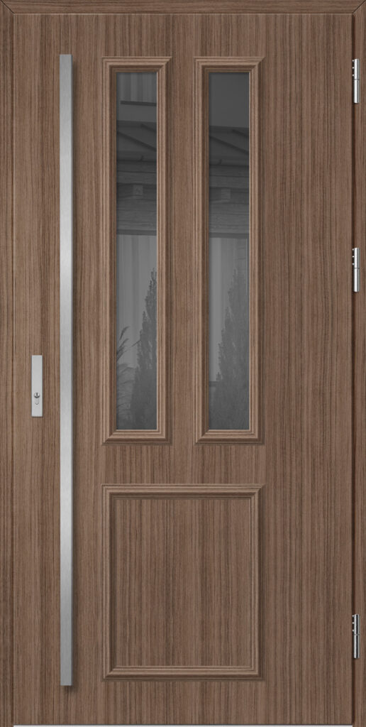 Drzwi wykonane z blachy stalowej, zabezpieczone okleiną PCV, która odznacza się wysoką odpornością na zmienne warunki atmosferyczne, promieniowanie UV. Zastosowanie wysokiej jakości materiałów, gwarantuje nie tylko estetykę, ale również trwałość i bezpieczeństwo na lata.