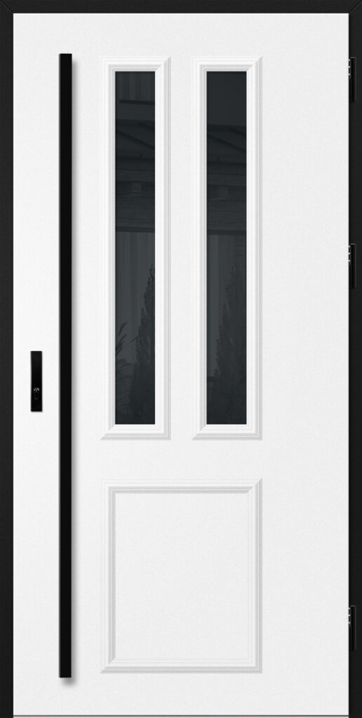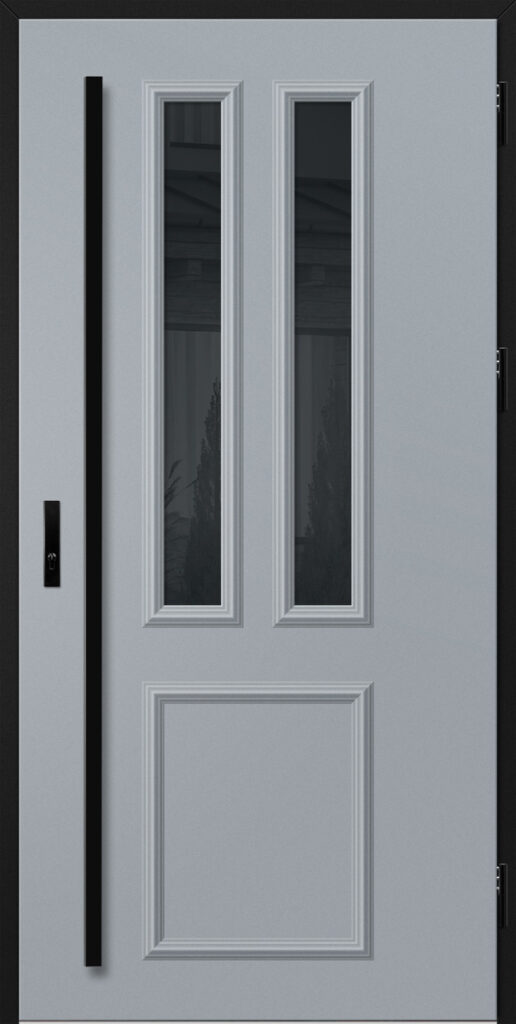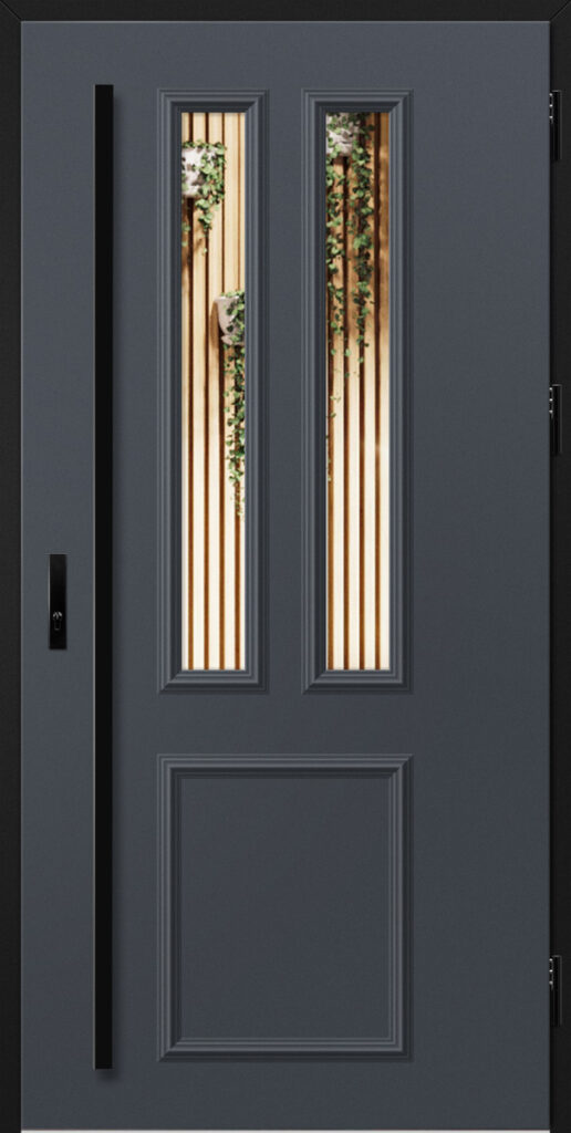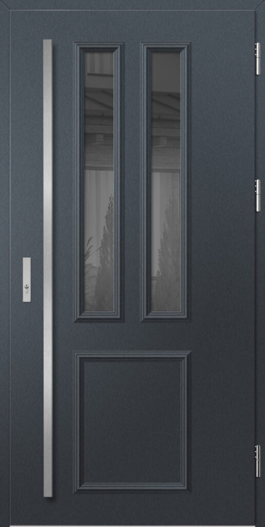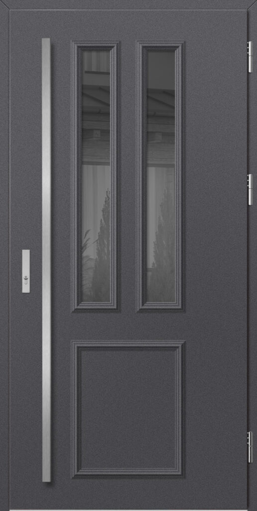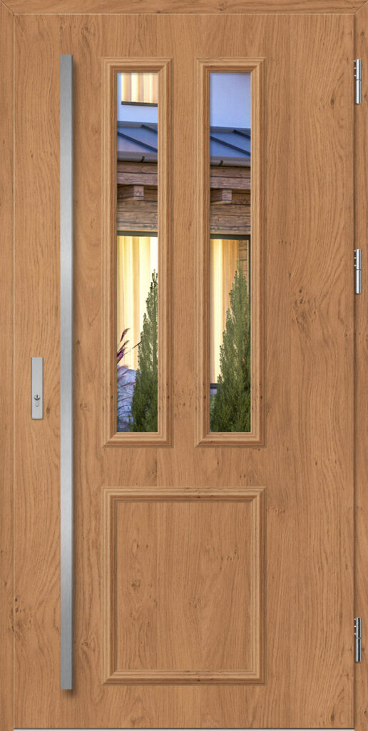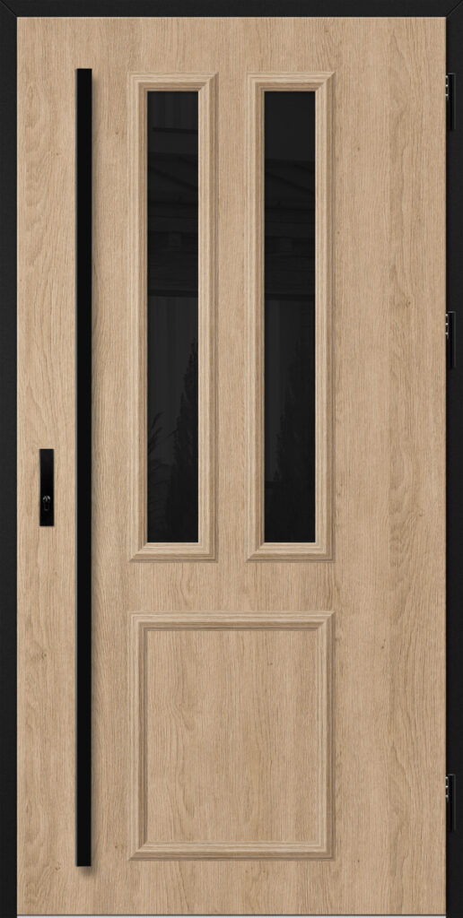 Drzwi wykonane z blachy stalowej, zabezpieczone okleiną PCV, która odznacza się wysoką odpornością na zmienne warunki atmosferyczne, promieniowanie UV. Zastosowanie wysokiej jakości materiałów, gwarantuje nie tylko estetykę, ale również trwałość i bezpieczeństwo na lata.