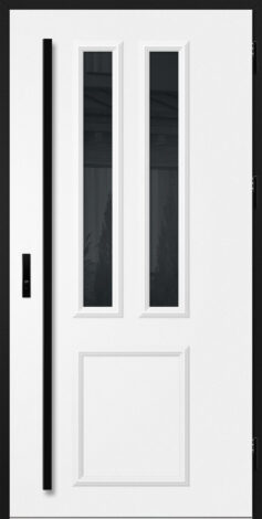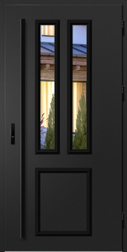 Ościeżnica aluminiowa, malowana na czarno i oklejona w kolorze skrzydła drzwiowego wyposażona w ciepły próg aluminiowy i pełną listwę zaczepową z regulacją docisku dla drzwi wykonanych w technologii THERMO HOT.