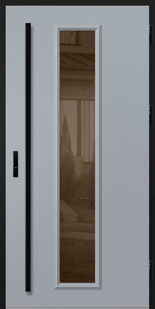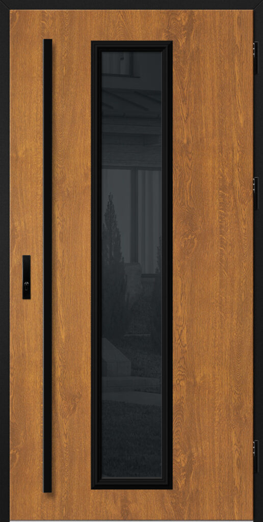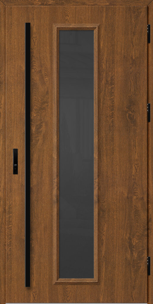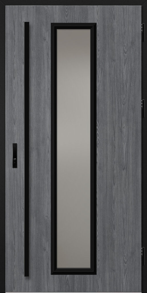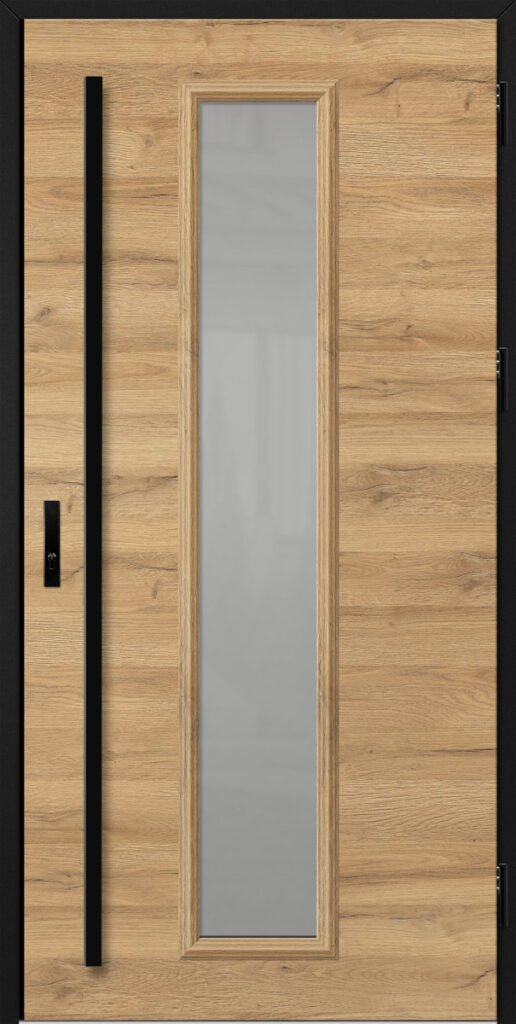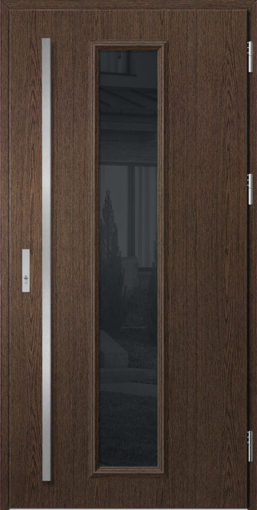 Drzwi wykonane z blachy stalowej, zabezpieczone okleiną PCV, która odznacza się wysoką odpornością na zmienne warunki atmosferyczne, promieniowanie UV. Zastosowanie wysokiej jakości materiałów, gwarantuje nie tylko estetykę, ale również trwałość i bezpieczeństwo na lata.