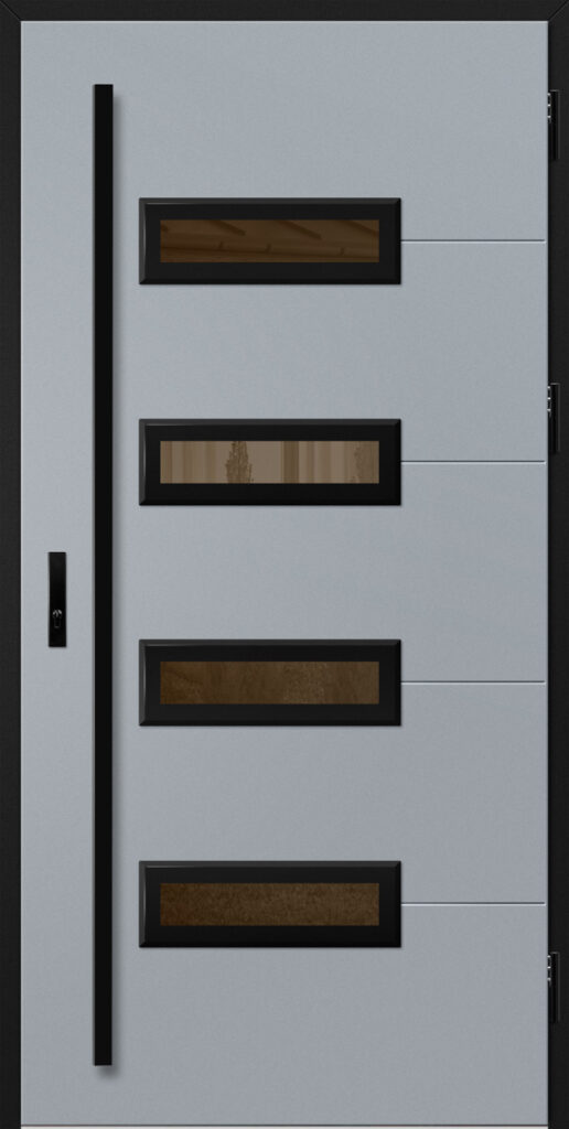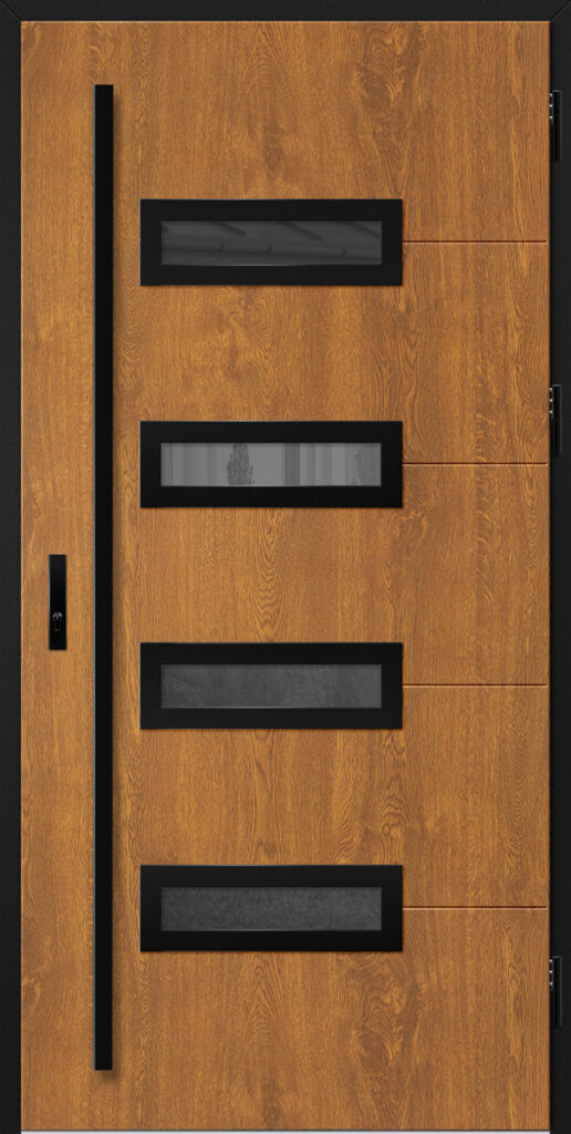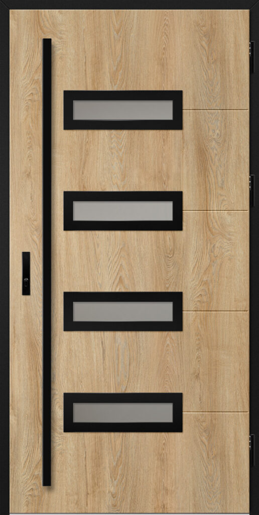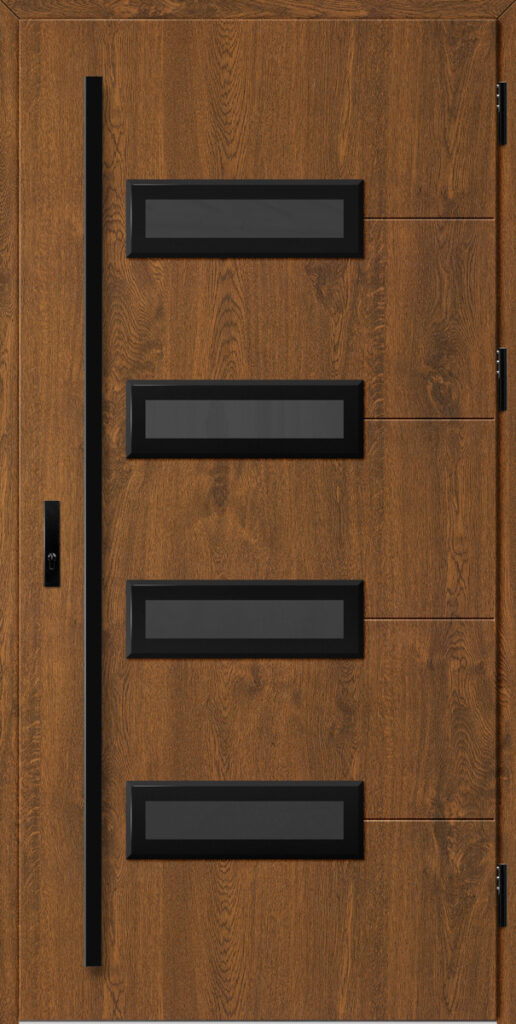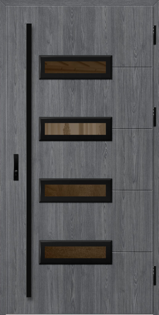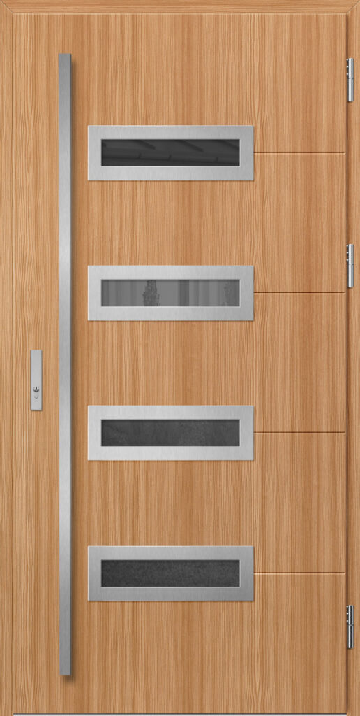 Drzwi wykonane z blachy stalowej, zabezpieczone okleiną PCV, która odznacza się wysoką odpornością na zmienne warunki atmosferyczne, promieniowanie UV. Zastosowanie wysokiej jakości materiałów, gwarantuje nie tylko estetykę, ale również trwałość i bezpieczeństwo na lata.