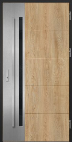 Drzwi wykonane z blachy stalowej, zabezpieczone okleiną PCV, która odznacza się wysoką odpornością na zmienne warunki atmosferyczne, promieniowanie UV. Zastosowanie wysokiej jakości materiałów, gwarantuje nie tylko estetykę, ale również trwałość i bezpieczeństwo na lata.