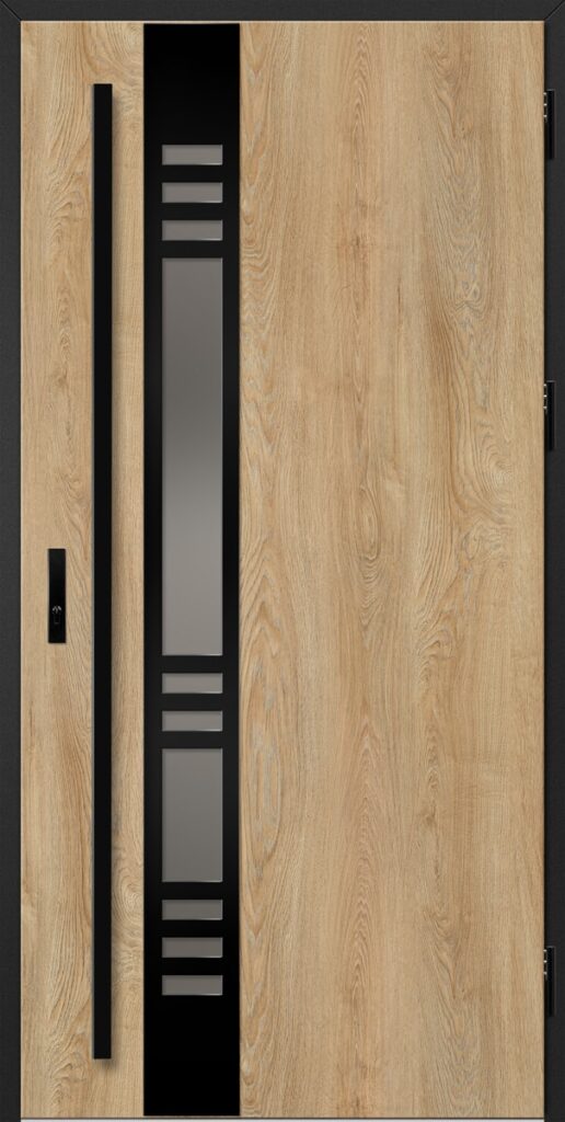 Drzwi wykonane z blachy stalowej, zabezpieczone okleiną PCV, która odznacza się wysoką odpornością na zmienne warunki atmosferyczne, promieniowanie UV. Zastosowanie wysokiej jakości materiałów, gwarantuje nie tylko estetykę, ale również trwałość i bezpieczeństwo na lata.